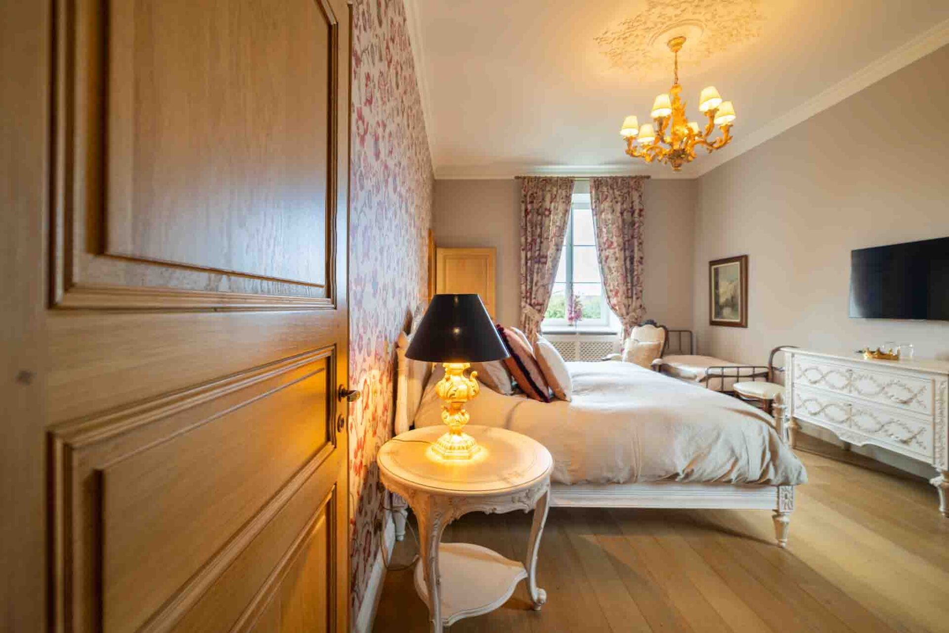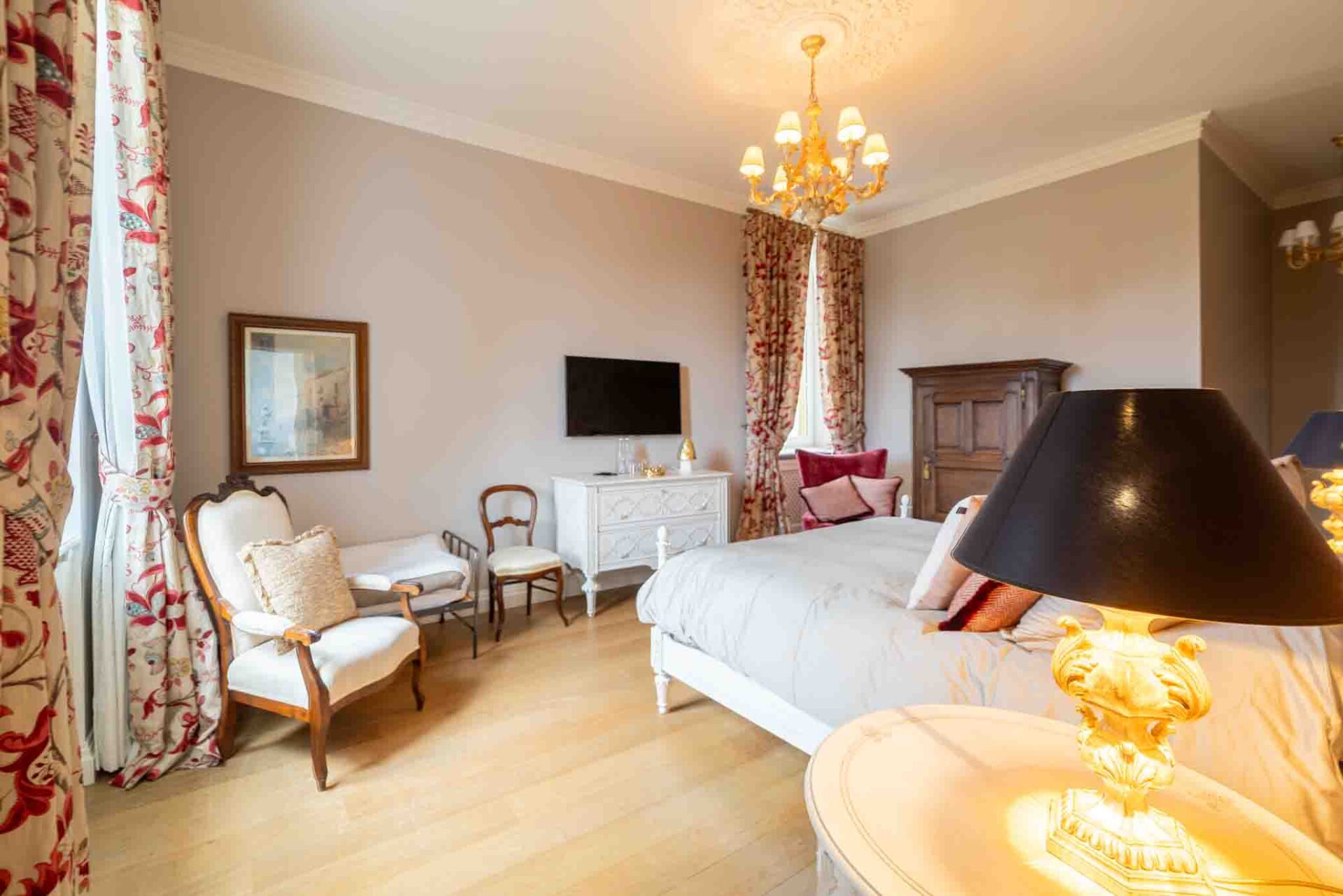 Entrez dans la Suite Cardinal, où l'élégance classique française rencontre le confort moderne. Avec son papier peint floral richement détaillé, ses meubles anciens en bois blanc et ses textiles luxueux, cette chambre de 32 m² exhale une atmosphère raffinée mais chaleureuse. La suite est ornée d'un grand lit et de sièges confortables, parfaits pour se détendre. Les clients peuvent profiter de la vue sereine depuis la fenêtre, encadrée par des rideaux lourds qui complètent les tons chauds de la pièce. La Suite Cardinal offre une expérience véritablement immersive dans le charme historique du Château de Berg, faisant de chaque séjour une retraite inoubliable.