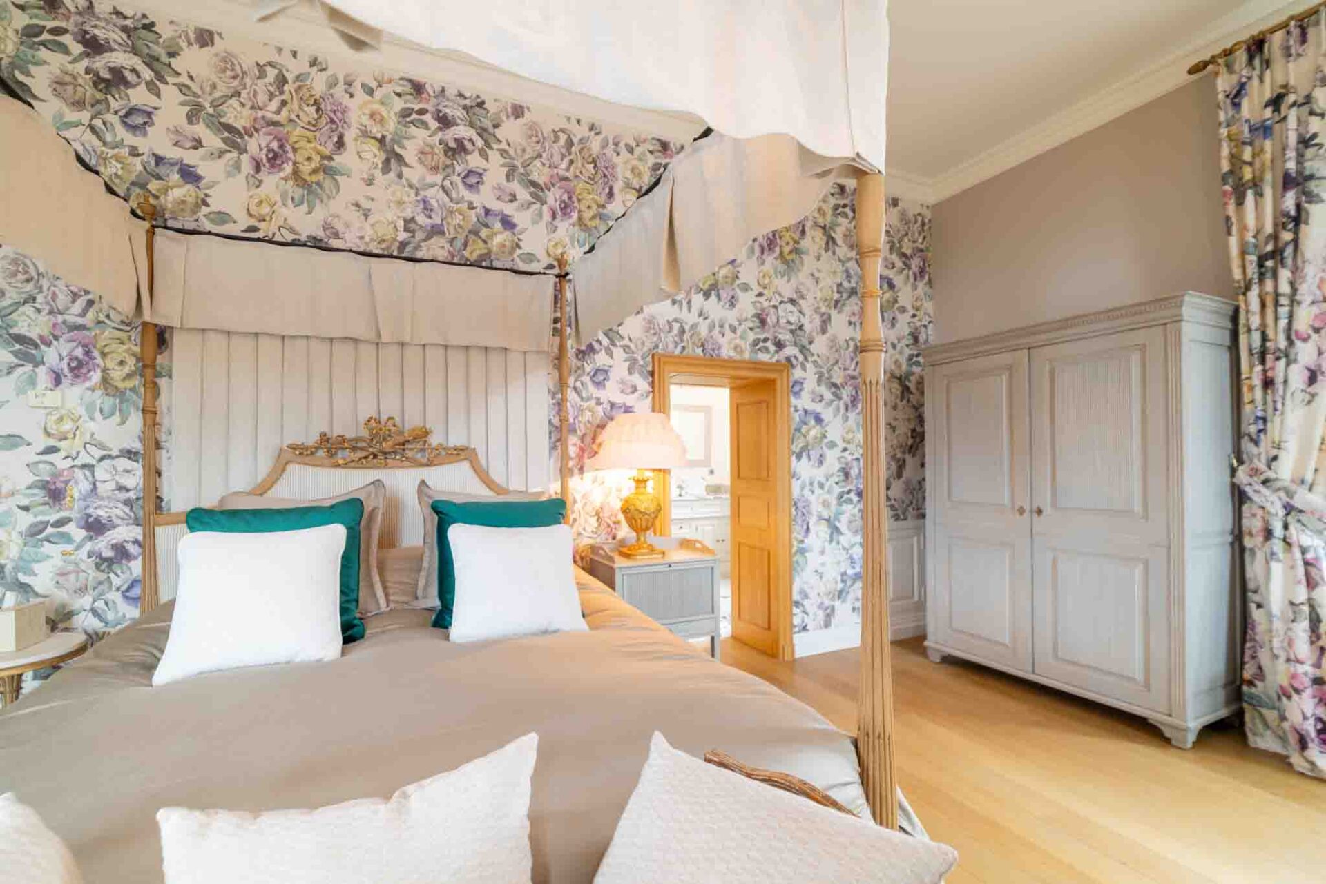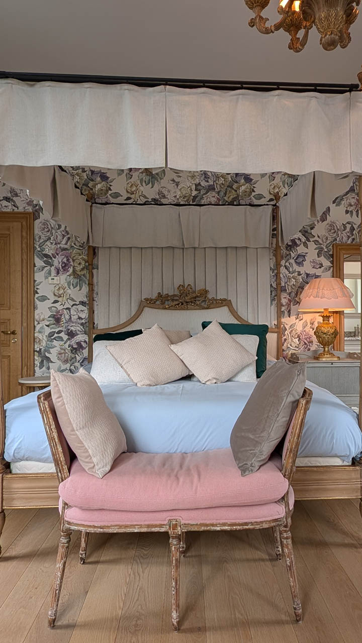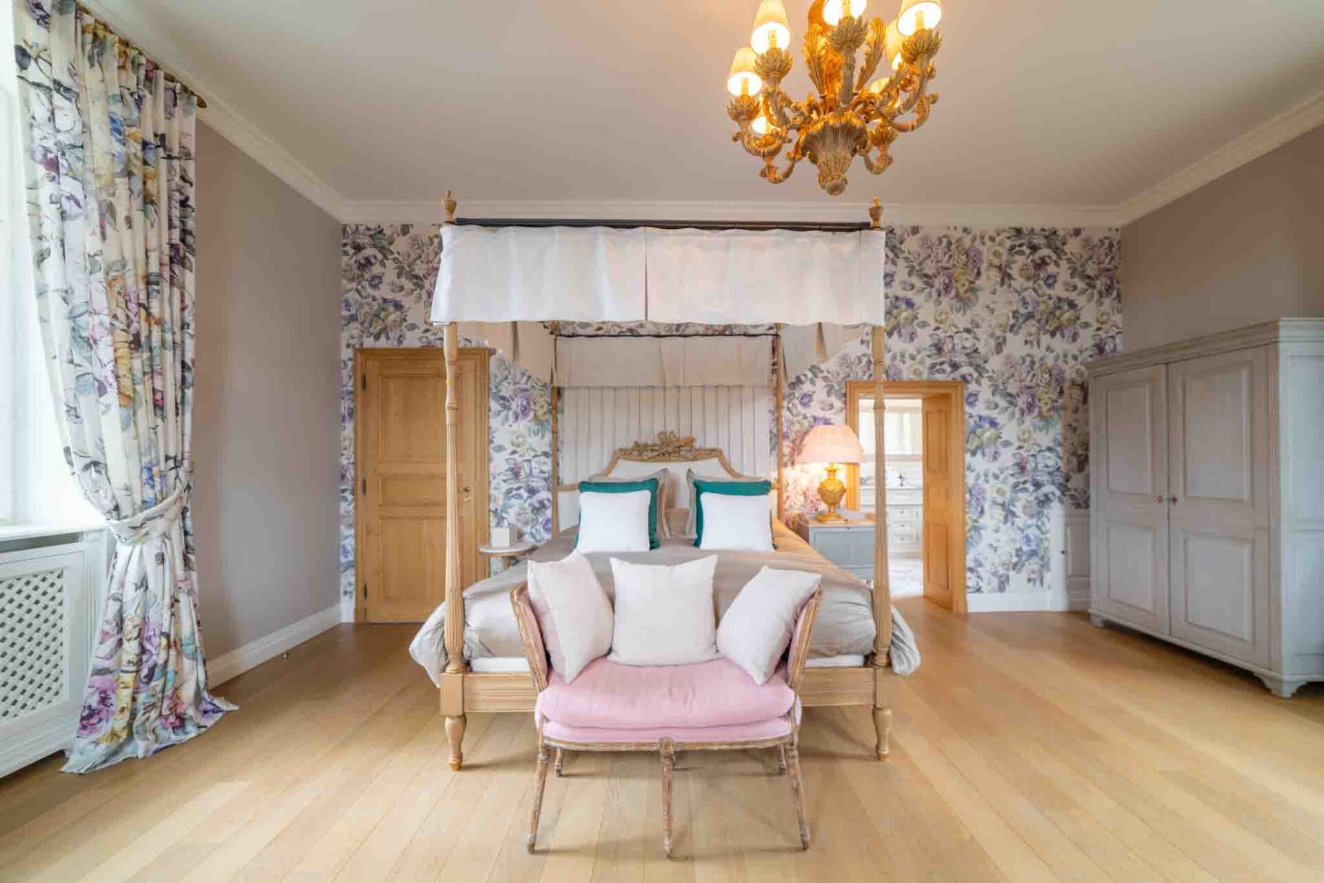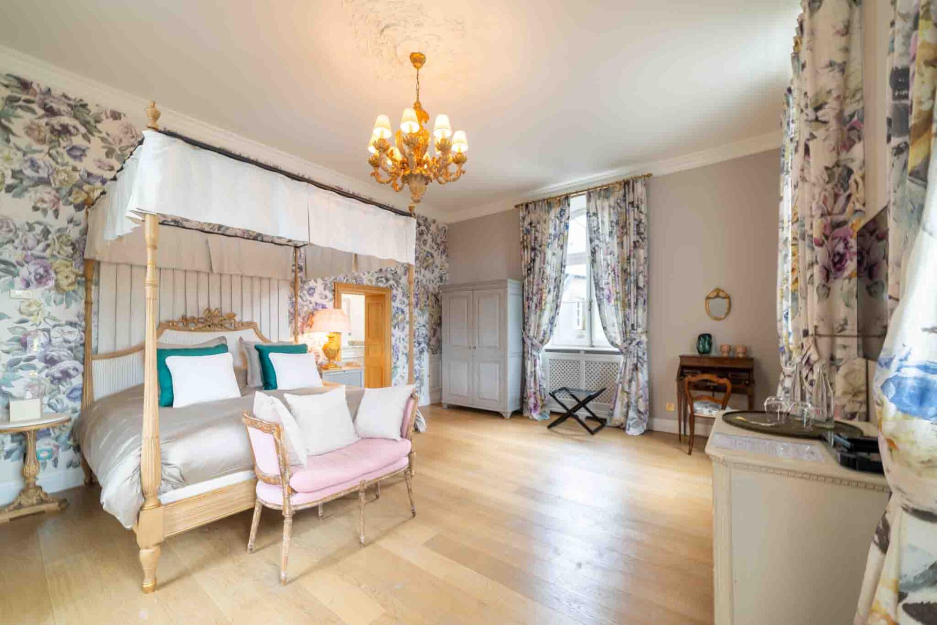 Entrez dans la Suite Cardinal, où l’élégance classique française rencontre le confort moderne. Avec son papier peint floral richement détaillé, ses meubles anciens en bois blanc et ses textiles luxueux, cette chambre de 32 m² exhale une atmosphère raffinée mais chaleureuse. La suite est ornée d’un grand lit et de sièges confortables, parfaits pour se détendre. Les clients peuvent profiter de la vue sereine depuis la fenêtre, encadrée par des rideaux lourds qui complètent les tons chauds de la pièce. La Suite Cardinal offre une expérience véritablement immersive dans le charme historique du Château de Berg, faisant de chaque séjour une retraite inoubliable.