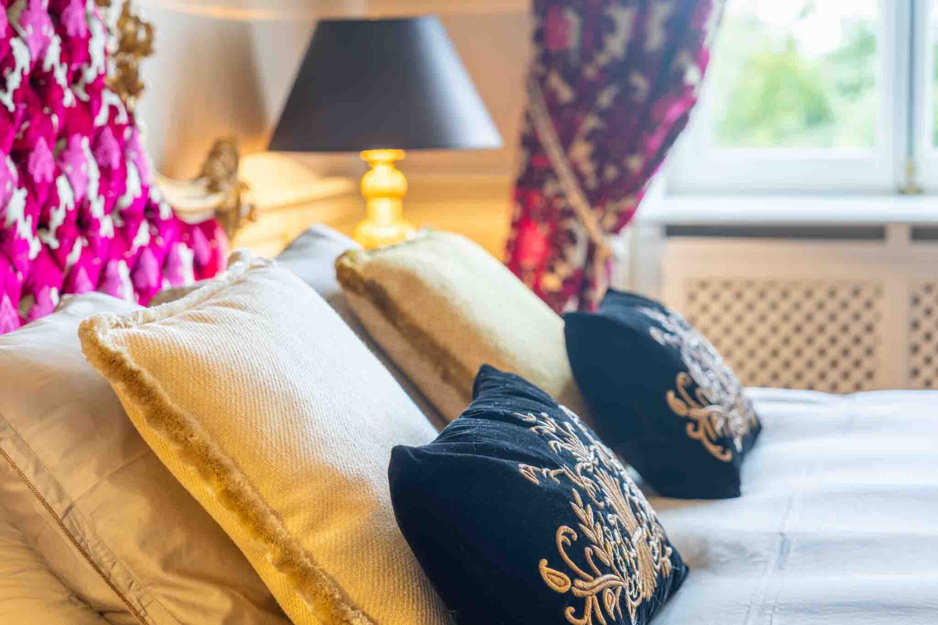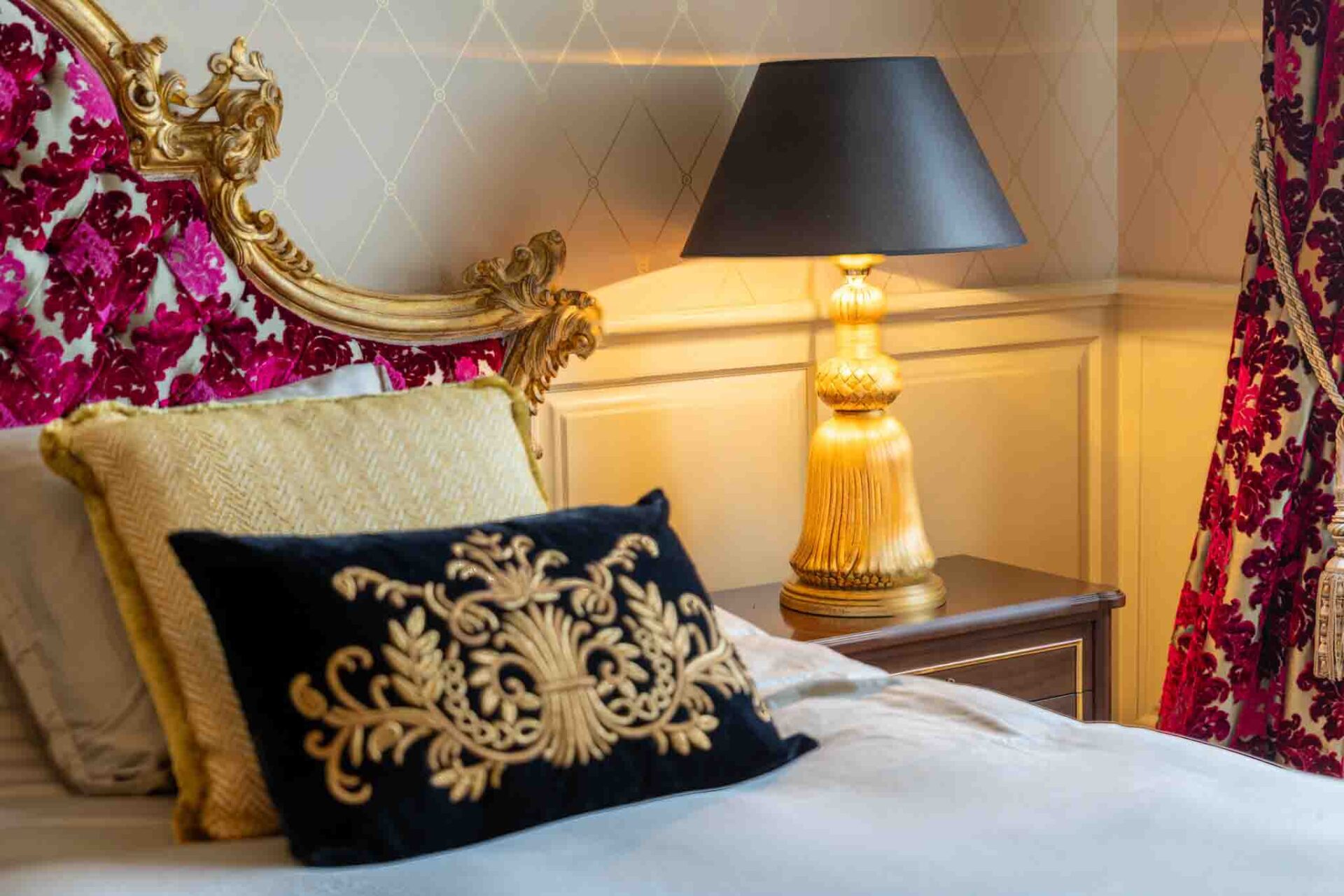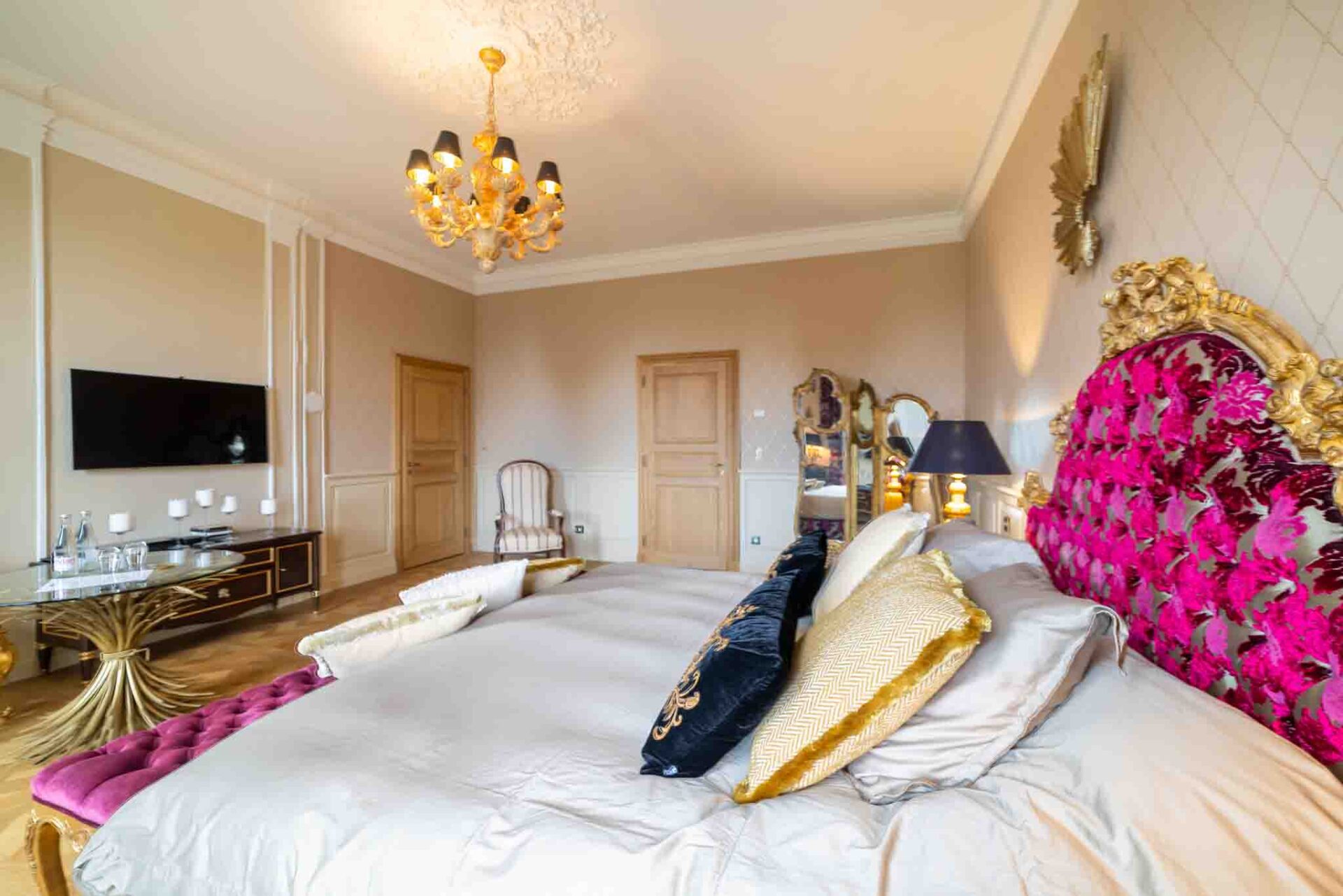 La Suite Empereur au Château de Berg offre une expérience luxueuse enveloppée dans une élégance classique. Cette chambre spacieuse de 45 m² est ornée de sculptures délicates, d’accents dorés et de tissus somptueux. Baignée de lumière naturelle, la suite surplombe un magnifique jardin à la française, créant un havre de paix sophistiqué. Profitez de l’accès à tous les espaces intérieurs et au jardin magnifiquement aménagé avec piscine, pour un séjour qui harmonise histoire et luxe moderne.