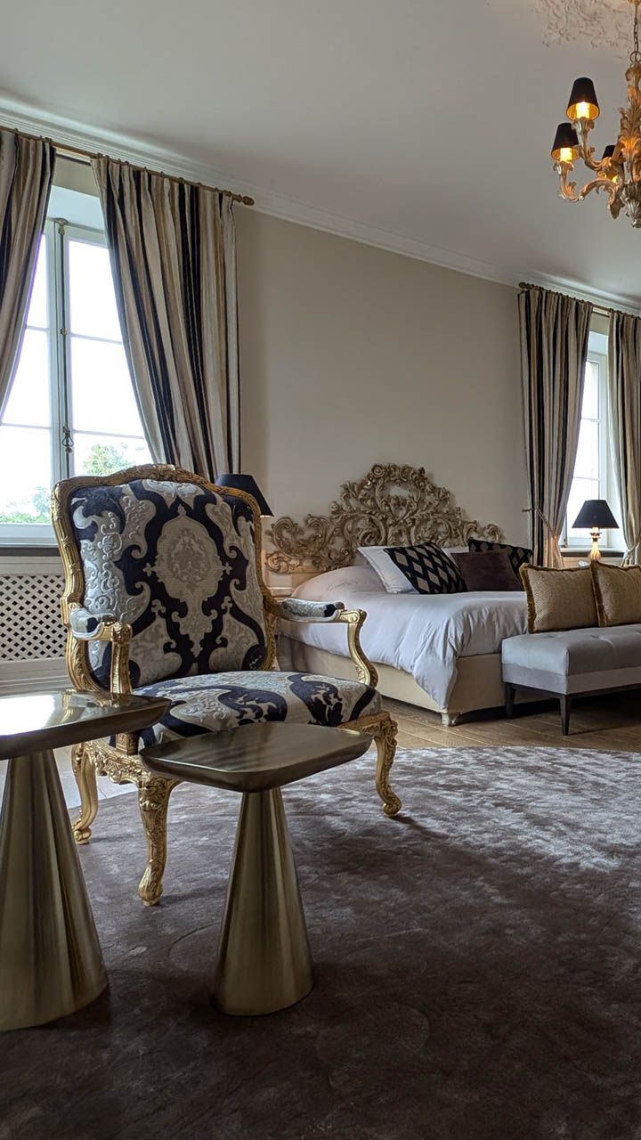 La Suite Empereur au Château de Berg offre une expérience luxueuse enveloppée dans une élégance classique. Cette chambre spacieuse de 45 m² est ornée de sculptures délicates, d’accents dorés et de tissus somptueux. Baignée de lumière naturelle, la suite surplombe un magnifique jardin à la française, créant un havre de paix sophistiqué. Profitez de l’accès à tous les espaces intérieurs et au jardin magnifiquement aménagé avec piscine, pour un séjour qui harmonise histoire et luxe moderne.