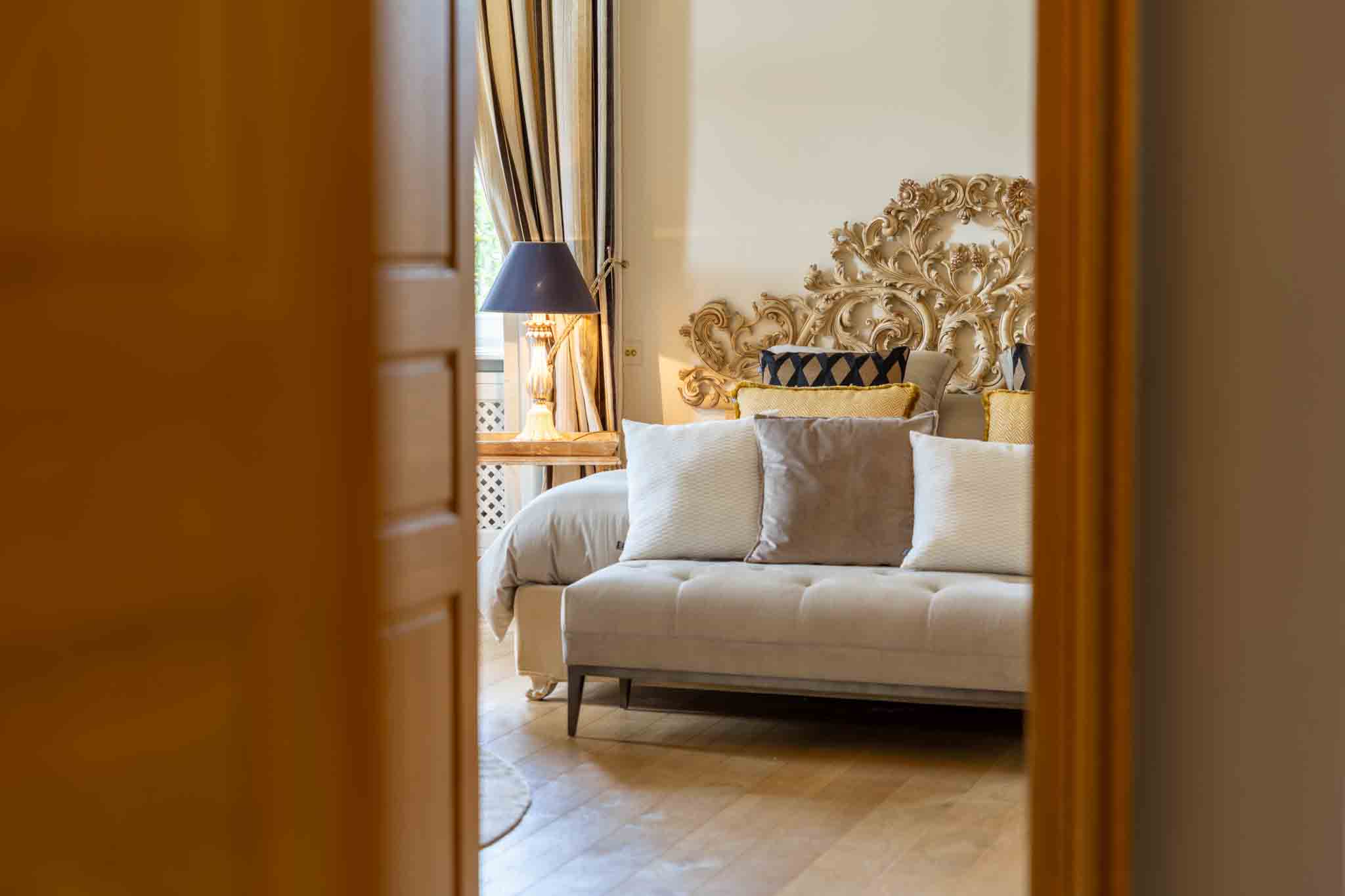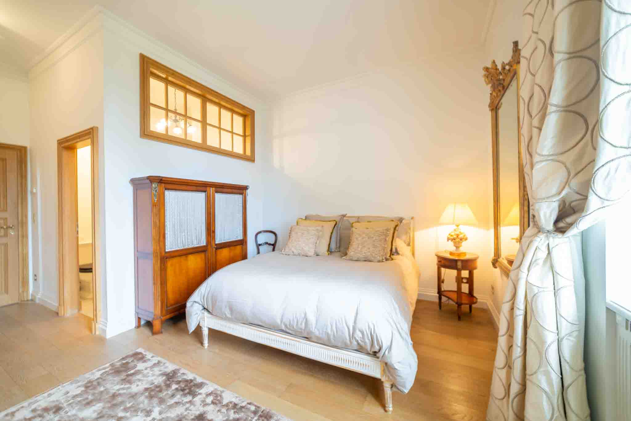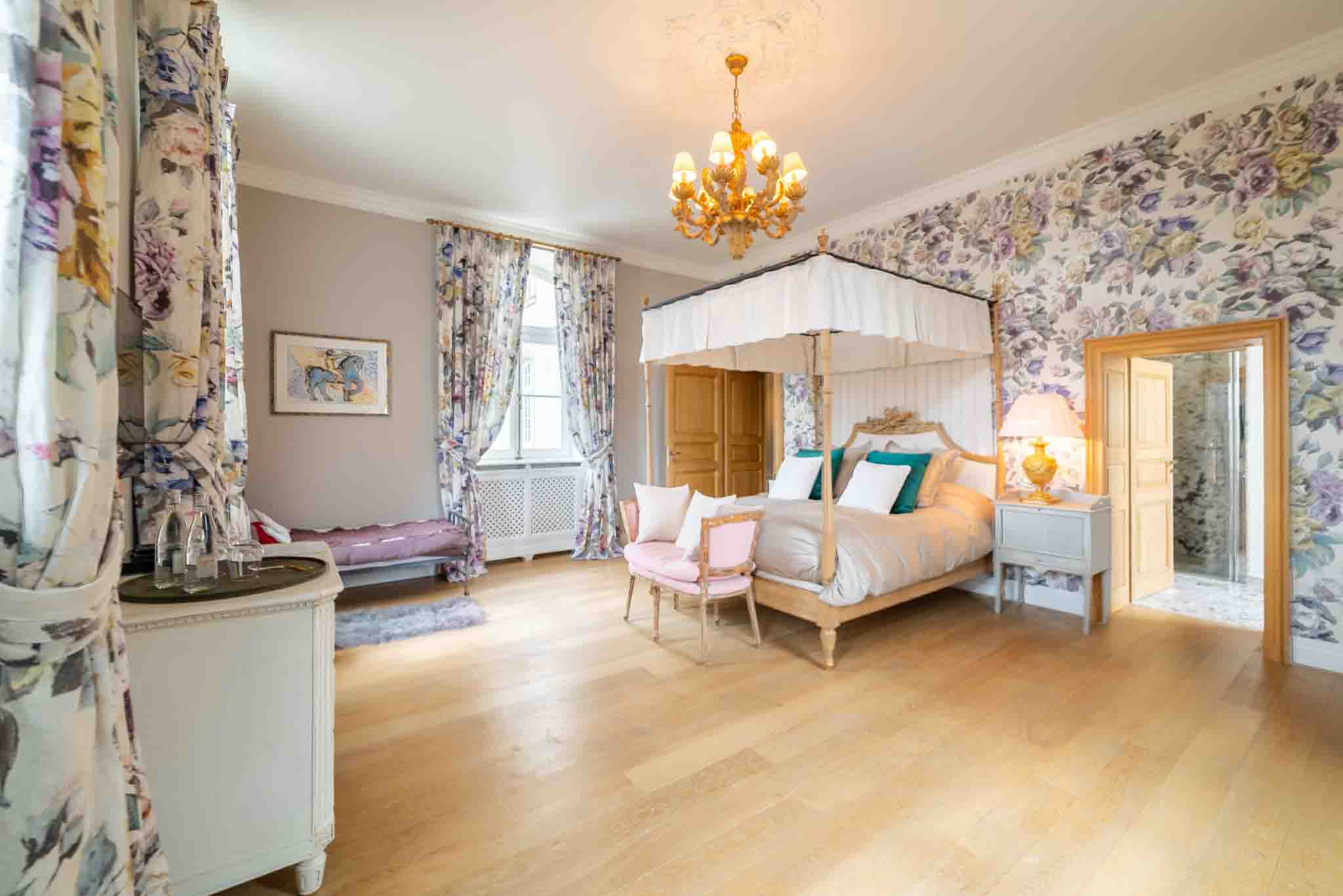 La Suite Empereur au Château de Berg offre une expérience luxueuse enveloppée dans une élégance classique. Cette chambre spacieuse de 45 m² est ornée de sculptures délicates, d’accents dorés et de tissus somptueux. Baignée de lumière naturelle, la suite surplombe un magnifique jardin à la française, créant un havre de paix sophistiqué. Profitez de l’accès à tous les espaces intérieurs et au jardin magnifiquement aménagé avec piscine, pour un séjour qui harmonise histoire et luxe moderne.