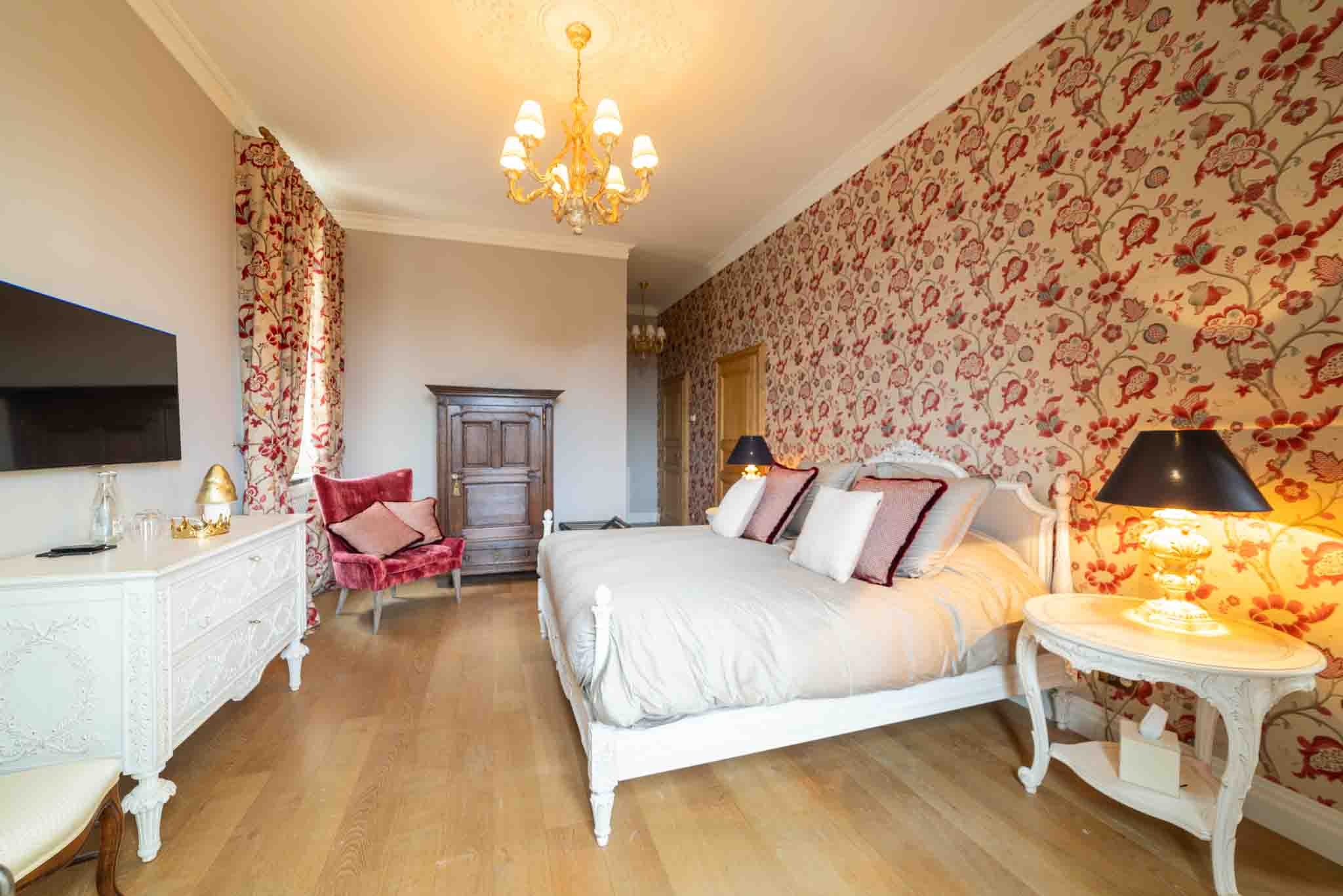Entrez dans la Suite Cardinal, où l’élégance classique française rencontre le confort moderne. Avec son papier peint floral richement détaillé, ses meubles anciens en bois blanc et ses textiles luxueux, cette chambre de 32 m² exhale une atmosphère raffinée mais chaleureuse. La suite est ornée d’un grand lit et de sièges confortables, parfaits pour se détendre. Les clients peuvent profiter de la vue sereine depuis la fenêtre, encadrée par des rideaux lourds qui complètent les tons chauds de la pièce. La Suite Cardinal offre une expérience véritablement immersive dans le charme historique du Château de Berg, faisant de chaque séjour une retraite inoubliable.